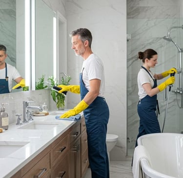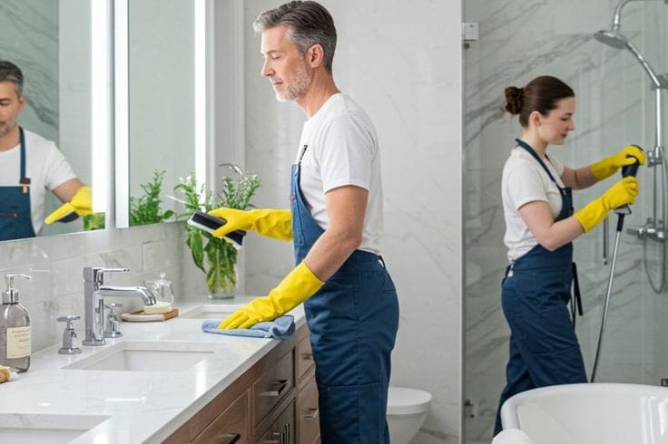 Klozet, lavabo, musluklar, duşakabin veya küvet hijyenik temizleyiciler kullanılarak ovulur ve durulanır.